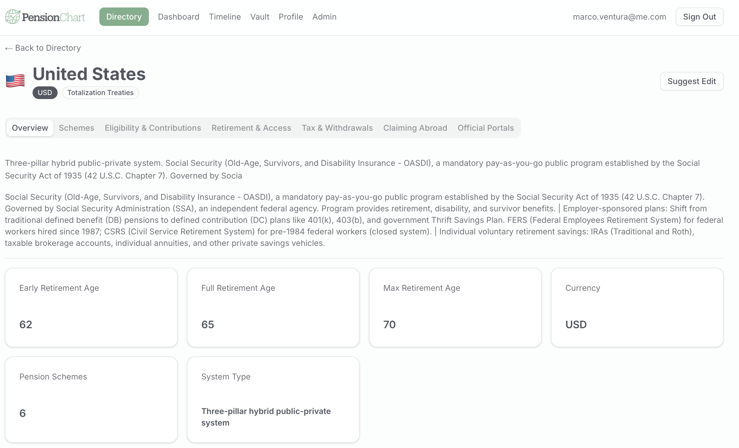 This is one of the most common practical challenges for globally mobile professionals. Every country has its own unique pension system โ there has never been any single global tool that allows users to research and consolidate everything in one place. PensionChart has built the most comprehensive directory of global pension data compiled from 47 countries around the world with information continuously updated via our Global Pension Agentsโข๏ธ as well as our community of expat professionals. Additionally, PensionChart gives you one place to track your pension data in an intuitive interactive timeline, so you can see your full retirement picture rather than a stack of disconnected statements.